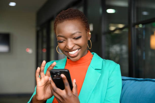 Waist-up view of shorthaired Black woman wearing hoop earrings, teal jacket over orange top, and smiling while scrolling portable device in modern office.